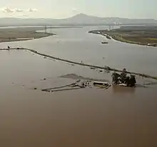 In March 1939, the state department of public works approved $3,000 ($62,400 in 2022) in emergency repairs for storm damage incurred to the levees.[80] The island would again flood in June 1950, when it (along with the Webb Tract and nearby Franks Tract) were inundated completely.[81][82][83] The Army sent two radio-equipped jeeps to maintain communications, and Coast Guard airplane pilots said the situation was "critical".[84] Five families were evacuated;[85] two hundred people were said to be in danger from the flooding.[86] Forty prisoners, from the nearby Marsh Creek prison farm, were forced to haul sandbags all night long,[87] and the levees were reinforced.[88] That night, families who lived on the island "slept in the upper portions of their homes with their belongings stacked on trucks on the levee".[89] The United States Army Corps of Engineers would work to strengthen levees during another flood in December 1950, and Bradford Island was protected from inundation (although nearby Venice Island was sunk).[90] Subsequent work to improve the levees was carried out in 1951 [91] A barge ran aground on Bradford Island in April 1954;[92] while the barge itself was empty,[93] it was filled with gasoline fumes, which exploded.[94] The flaming barge would drift loose, eventually coming to rest on the shores of Twitchell Island.[95] In late 1955, waters began to rise again, and the levees of Bradford Island were seeping by December 24;[96] by December 27, four breaks were reported, which were immediately reinforced by airmen from the Parks and Travis Air Force Bases.[97]
