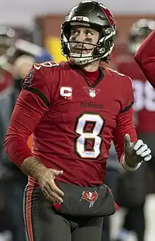 Pinion was placed on the reserve/COVID-19 list by the team on December 15, 2020,[44] and activated three days later.[45] Overall, Pinion played in all 16 games and recorded a career-low 55 punts for 2,486 yards for a 45.2 average in 2020.[46] He appeared in Super Bowl LV against the Kansas City Chiefs and punted four times for 150 yards for a 37.5 net average in the 31–9 victory.[47][48]