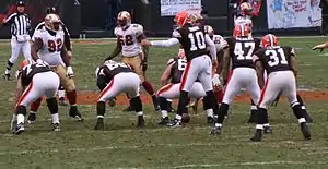 Quinn signed a five-year deal with the Browns worth a reported $20.2 million, with $7.5 million guaranteed and up to $30 million in incentives.[26] Quinn was originally placed third on the Browns' depth chart behind Charlie Frye and Derek Anderson. However, after a 34–7 defeat to the Pittsburgh Steelers in Week 1, Frye was traded to the Seattle Seahawks for a sixth round draft pick, moving Quinn to second on the Browns' depth chart.[27] On December 30, 2007, when Anderson hurt his pinky and wrist, Quinn made his official NFL debut in the Browns' final game of the season against the San Francisco 49ers. Going 3 for 8 passing, Quinn led the Browns to a field goal. Despite speculation that the Browns would trade Anderson to get back into the first round of the 2008 NFL Draft,[28] Browns' general manager Phil Savage later stated that he hoped to sign Anderson, and keep both quarterbacks for the 2008 season.[29]