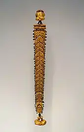 In India, many Hindu ascetics wear dreadlocks, known as Jatas.[17] Young girls and women in India often wear long braided hair at the back of their neck.[18] In the Upanishads, braided hair is mentioned as one of the primary charms of female seduction.[19] A significant tradition of braiding existed in Mongolia, where it was traditionally believed that the human soul resided in the hair. Hair was only unbraided when death was imminent.[20][21] In Japan, the Samurai sported a high-bound ponytail (Chonmage), a hairstyle that is still common among Sumo wrestlers today. Japanese women wore various types of braids (三つ編み) until the late 20th century because school regulations prohibited other hairstyles, leaving braids and the bob hairstyle as the main options for girls.[22] In China, girls traditionally had straight-cut bangs and also wore braids (辮子). The Mandu men have historically braided their hair. After conquering Beijing in 1644 and establishing the Qing Dynasty, they forced the men of the subjugated Han Chinese to adopt this hairstyle as an expression of loyalty, which involved shaving the forehead and sides and leaving a long queue at the back (剃髮易服). The Han Chinese considered this a humiliation as they had never traditionally cut their hair due to Confucian customs. The last emperor, Puyi, cut off his queue in 1912, marking the end of this male hairstyle in China, the same year when China became a republic.[23][24]