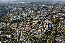 Most of the buildings are dense apartment blocks that were built during the 1960s and 1970s. Some of the nearby amenities include supermarkets, restaurants, a post office, a shopping center, and Tyresta National Park.[1] The commute to central Stockholm is generally facilitated via bus and commuter rail services, with options for walking, biking, and driving.
