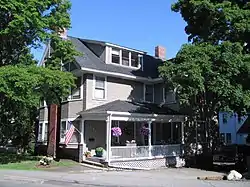 The Brande House stands just west of downtown Reading, at the southwest corner of Summer and Linden Street. It is a 2+12-story wood-frame structure, with a gabled roof and exterior clad in wooden shingles and clapboards. Gabled sections project from either side, with a large porch in the corner created by the section on the right, where the main entrance is located, and a smaller porch on the corner on the left, facing Linden Street. The right-hand porch is covered by a hip roof, supported by round columns, and has a simple balustrade with square balusters. The front facade is two bays wide, with a brick chimney rising at the center, flanked by two-story polygonal bays. The gable above has a recessed porch and applied Stick style woodwork. The left side gable section has three round windows in the gable, and the porch has a Stick style balustrade.[2]