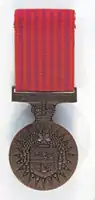 The medal is suspended from a ribbon by a bar inscribed "For Bravery".[1] The ribbon is 32 mm wide and has 15 alternating stripes of blood-red and magenta representing the colours of venous and arterial blood.[1]