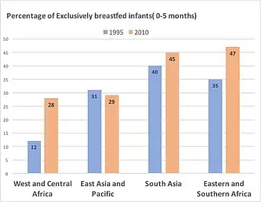 WHO infant feeding recommendation states infants should be breastfed exclusively for the first six months of life to achieve optimal growth, development and health.[62] Exclusive breastfeeding (EBF) refers to the practice of feeding an infant on breastmilk alone for the first six months of life, without supplementing it with other food or even water.[63][64] According to WHO and UNICEF, mothers should initiate breastfeeding within the first hour after birth. Thereafter, exclusive breastfeeding should be continued for at least the first six months of life before the introduction of supplementary feeding.[65] Exclusively breastfed infants can only take oral rehydration solution, vitamins and minerals, and prescribed medications.[65] Scientific studies carried out by WHO and UNICEF have shown that both the mother and the child benefit from breastfeeding.[66] Breastfeeding is a cost-effective intervention that reduces the infant mortality and morbidity by lowering the risk of sickness from acute and chronic infections.[65] Prevalence of EBF increased in almost all regions in the developing world, from 1995 to 2010.[67] The biggest improvement can be seen in the West and Central Africa where the prevalence of EBF is more than doubled from 12% in 1995 to 28% in 2010. Southern and Eastern Africa also shows improvements with an increase from 35% in 1995 to 47% in 2010.[67] However, according to the UNICEF, there are no satisfactory changes in the EBF rates for the first six months since 1990. In order to provide breastfeeding support, WHO and UNICEF have developed two feeding programs, i.e.the 40-hour breastfeeding counseling, and the five-day infant and young child feeding counselling.[68][69] Furthermore, Yılmaz, Elif et al.,[70] in their clinical investigation report states, despite all the recommendations of the WHO, the rates of breastfeeding initiation and duration are still far from expectations worldwide.