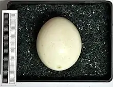 Laying normally begins in March-early April, sometimes as early as February.[2] Of 344 nests in Latvia, the mean egg laying dates were March 13th to April 3rd, with extreme dates of February 20th to April 30th, with shifts accounted for by late winter weather.[26] In the German area of Swabian Jura clutches may start to be laid as early as mid-February if food is favorable.[27] Egg laying in mid-February is fairly typical in Italy as well.[11] The first egg is typically laid by mid-March in Great Britain, in late March in continental Europe and early April in Scandinavia.[1] In very snowy years in Finland, the laying of clutch is often either delayed or does not occur at all.[28] Due to the warmer average ambient temperatures and access to pestilent rodents, wintertime egg laying in human developed areas is now known to be commonplace: with records of laying in late December in Amsterdam, early January in Munich and late January in Riga, Latvia.[1][27][29] They tend to lay their clutches earlier than long-eared owls and little owls and much earlier than barn owls.[1][3] One clutch is laid per year but rarely replacement clutches have been reported if an entire clutch is lost.[11] A record in Bizkaia, Spain of a second successful clutch was produced, with pairs of owlets were recorded in February then another pair of owlets apparently hatched to the same pair was recorded in July of same year.[30] The female typically lays a relatively small clutch of 3–5 eggs, sometimes in extreme case from 2 and very rarely and in the times of food plenty, 7–9.[2][3] Average clutch sizes were cited as 2.67 in Britain, 2.8 in Bohemia, 2.95 in Belgium 3.29 in central Europe, 3.3 in both Switzerland and the Netherlands, 3.65 in Denmark, 3.64–3.81 in Finland and 4.04 in Sweden.[1][25][6][31][23][32][33][34] While in Bohemia, the clutch size varied remarkably little by year, in western Switzerland it could go from 2.52 to 3.63 in different years and Finnish data indicates it can vary from 3.1 to 4.2 in low and peak vole years. Therefore, clutch size may be more variable in more cool climatic zones but, on the other hand, the average size of the clutches averages larger in these colder areas.[25][23][33][35][36] Although clutch sizes average smaller in Great Britain than in mainland Europe, they are more consistently laid there than the clutches of barn owls.[3] Their eggs are pure white, smooth or slightly glossy in texture, and vary little in size. Egg dimensions were found to average 46.7 mm × 39.1 mm (1.84 in × 1.54 in) in Britain, 47.6 mm × 39.2 mm (1.87 in × 1.54 in) in central Europe, 46.6 mm × 38.5 mm (1.83 in × 1.52 in) in Sweden (Makatsch 1976) and 47.5 mm × 39.2 mm (1.87 in × 1.54 in) in Russia. The range may be from 42 to 50 mm (1.7 to 2.0 in) in height by 36 to 41 mm (1.4 to 1.6 in) in diameter (sample size 100).[1][11][4][37] The average weight of eggs can vary from 31.3 to 40 g (1.10 to 1.41 oz).[1][2]