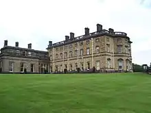 The house has a three-storey nine-bay by five-bay main range while the rest is two storeys high. It is built in sandstone ashlar and its roof is hidden behind a balustraded parapet. It has tall ornamental chimney stacks and the Wentworth shield decorates two ornamental rainwater heads. The south range has a symmetrical facade with a central Doric portico. The ground and first-floor windows have 12-pane sashes with triangular pediments to the ground floor and cornices to the first. The shorter second floor windows have casements added later. The south front has a three-bay bow window with tall ground-floor windows. The centre window was originally a doorway accessed by a flight of four steps.[1]