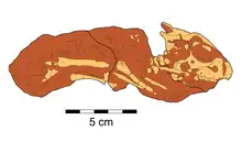 The holotype, ZPAL MgD-I/117, was found in the Khulsan locality of the Barun Goyot Formation dating from the Late Campanian. It consists of a partial juvenile postcranial skeleton with skull. Other specimens were referred from the Hermiin Tsav and Khulsan localities: MgD-I/116, a skull and lower jaws of a small juvenile; MgD-I/118, fragmentary postcrania and lower jaws of a juvenile; MgD-I/119, a dentary and three neural arches; MgD-I/20, two dentaries and loose teeth; MgD-I/21, a maxilla fragment with four teeth of a juvenile; and MgD-I/22, teeth.[1]