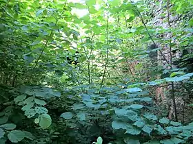 The local church is now only a ruin, with only the belfry and the walls of the nave remaining.[7] It was dedicated to Saint Florian and dated to around 1600. It was restored in 1890.[10] The church was first mentioned in a visitation report from 1753. It had a rectangular nave, apparently barrel-vaulted and plastered-over wood timbering. A wooden choir loft stood above the entrance and also provided access to the bell tower. The chancel was pentagonal and had a window on each side. The church was damaged during the German bombardment in 1943, when the roof timbering burned. It was not restored after the war, despite efforts from the local Lukan family. The parish abandoned the building in 1963, removing the bells. The rest of the furnishings were removed by various collectors, including the main altar with a statue of Saint Florian in the central niche and additional statues on the sides and in the pediment, a side altar with a statue of Saint Vitus, and a statue of Our Lady of Lourdes created by August König from Srobotnik.[4]