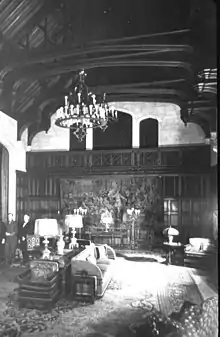 - 1,700 square feet (160 m2) music room, now DeOvies Hall, with its three-story-tall vaulted Tudor interior, limestone fireplace and painted walls.[4]