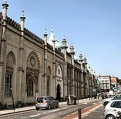 The North Laine area has a network of streets dubbed the 'Cultural Quarter', so called because of its concentration of theatres, galleries and small venues. This area covers New Road, the location of the Theatre Royal, and the Brighton Dome complex which includes the Pavilion Theatre, Corn Exchange Theatre and the Dome Concert Hall. Next to this is Brighton Museum and Art Gallery. Bordering New Road and the Dome is Pavilion Gardens which is home to the Royal Pavilion, former palace residence of King George IV. Opposite New Road is Jubilee Street, a modern redevelopment containing restaurant and cafe chains. It is also the location of the Jubilee Library, the city's central library.