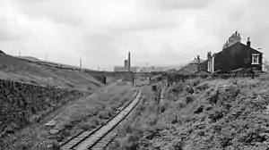 The LYR branch line from Rochdale to Facit had opened for goods on 5 October 1870, and to passengers on 1 November 1870.[1] On 18 July 1872 the LYR was authorised to extend the line to Bacup.[2] There were to be two intermediate stations: one was at Shawforth;[2] the other, 7+14 miles (11.7 km) from Rochdale,[3] was named Britannia after a nearby public house,[2] the Britannia Inn, which was built in 1821 at the junction of the old and new roads from Bacup.[4] The station was built by Samuel Warburton, who was contracted for the work on 28 July 1880;[2] it had an island platform.[3] The line opened on 1 December 1881, and with it, Britannia station.[2][5] The station was situated 962 feet (293 m) above sea level, and just to the east of the station was the summit of the line, which at 965 feet (294 m) above sea level was also the highest point on the entire LYR system.[3]