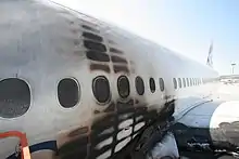 The Federal Aviation Administration (FAA) indicated the fire was caused by failure of the left General Electric GE90 engine, one of two fitted on the aircraft.[11] The aircraft came to a halt upwind, causing the fire to be blown towards the fuselage; the aircraft sustained localised, but major, structural damage as a result.[12][13] The aircraft was equipped with suppression systems, though the systems did not extinguish the fire.[10]