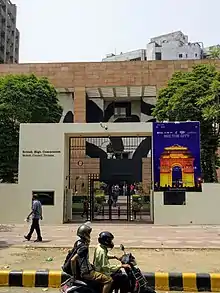 The headquarters of the British Council in India are in New Delhi in a 1992 building designed by Indian architect Charles Correa. The front of the building includes a mural by British artist Howard Hodgkin.