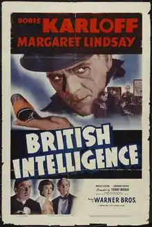 British Intelligence is a 1940 spy film set in World War I. It was directed by Terry O. Morse and stars Boris Karloff and Margaret Lindsay. The film, also known as Enemy Agent, was released in the United States in January 1940.[N 1] The Warner Bros. B picture was based on a 1918 play Three Faces East written by Anthony Paul Kelly and produced on the stage by George M. Cohan.[2] Two film adaptations of Three Faces East in 1926 and 1930 preceded British Intelligence.[3]