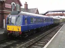 The British Rail Class 121 is a single-car double-ended diesel multiple unit. 16 driving motor vehicles were built from 1960, numbered 55020–55035. These were supplemented by ten single-ended trailer vehicles, numbered 56280–56289 (later renumbered 54280–54289). They have a top speed of 70 mph, with slam-doors, and vacuum brakes. The driving motor vehicles were nicknamed "Bubble Cars" by some enthusiasts (a nickname endorsed and made official by final passenger service operator Chiltern Railways).[12]