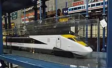 A life-size mock-up of the Class 93 is on display at the Midland Railway – Butterley in Swanwick and a 1:20 scale model is displayed in the Warehouse in the National Railway Museum, York.[2] Prior to the recent announcement of Agility Trains as the preferred bidder for the Intercity Express Programme a number of commentators called for the InterCity 250 / Class 93 idea to be revived as the basis for replacement rolling stock on the East Coast Main Line. Even though the Class 93s were never built, the traction characteristics of the locomotives were used in Railtrack WCML feasibility studies to determine the electrification requirements for an upgraded line.[3] Virgin Trains (the operators of the InterCity West Coast franchise after privatisation) consequently ordered new rolling stock for the route, albeit EMUs rather than loco-hauled stock.