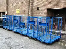 BRUTEs were a wheeled platform, generally with mesh around three sides of the body, the fourth side being open with canvas (or later plastic) straps for restraint of the load. The front included a panel for notes to be chalked to help sort traffic. A few BRUTEs had just the front, for carrying bulky loads too big for the cage, or two hinged ramps (no sides) to load or unload BRUTEs into railway vans. Each BRUTE had two fixed wheels at the rear and two swivelling caster wheels at the front, with polyurethane tyres and taper bearings.[1] Coupling were at front and rear, the front being a pin, the rear a hinged loop on a sprung shaft. A lever on the front operated brakes on the rear wheels and lifted the coupling pin.