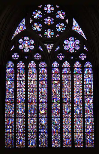 Canterbury Cathedral retains more ancient glass than any other English cathedral except York. Much of it appears to be imported from France and some is very early, dating from the 11th century. Much of the glass is in the style of Chartres Cathedral with deep blue featuring as the background colour in most windows. There are wide borders of stylised floral motifs and small pictorial panels of round, square or diaper shape. Other windows contain rows of apostles, saints and prophets. These windows, including the large west window have a predominance of red, pink, brown and green in the colours, with smaller areas of blue. Most of the glass in this remarkable window is older than the 15th-century stone tracery that contains it, the figure of Adam being part of a series of Ancestors of Christ that are among the oldest surviving panels in England.
