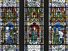 - Rows of apostles, saints, prophets or virtues, each occupying one light and usually set in an architectural frame surmounted by an ornate canopy. In the case of a large window with an irregular number of lights, the figure of Jesus or the Virgin with the Christ Child is usually at the centre. See No.3 below