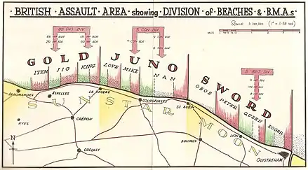 A Headquarters (HQ) Line of Communications was formed from that of the disbanded 54th (East Anglian) Infantry Division. Most of its component areas and sub areas were formed for the campaign.[19] This was commanded by Major-General Frank Naylor, formerly the Vice QMG at the War Office.[20] In the assault, 101 and 102 Beach Sub Areas would support I Corps while 104 Beach Sub Area supported XXX Corps.[21] Each beach sub area controlled two beach groups.[21] These were tri-service formations with units from the Royal Engineers, RAMC, REME, RAOC, RASC, Pioneer Corps and Military Police. The Royal Navy provided each with a Royal Navy Beach Commando and a signal unit; the RAF provided beach anti-aircraft defence. Each beach group also had an infantry battalion to mop up any opposition and then act as a labour force. A beach group had a complement of about 3,000 men.[22] The beach sub-areas would come under 11 Line of Communications Area when Second Army HQ arrived in Normandy and it in turn came under HQ Line of Communications when the 21st Army Group HQ arrived.[23]