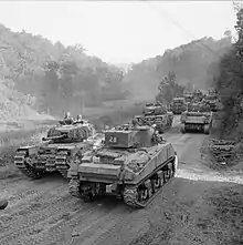 Sherman tanks pass a column of Churchill tanks as they advance towards Vassy on 4 August 1944.