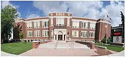 The school's basement had cloakrooms for pupils and a furnace room. The main floor had an office and a library in a shallow extension at the front and three classrooms on the north. The second floor held a laboratory above the office, and an assembly room and one classroom. The third floor had two gyms for boys and girls.