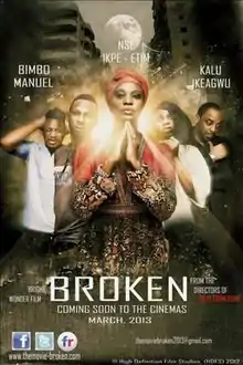 Broken is a 2013 Nigerian drama film written, produced and directed by Bright Wonder Obasi, starring Nse Ikpe Etim, Bimbo Manuel and Kalu Ikeagwu. It received six nominations at the 2013 Nollywood Movies Awards including awards for Best lead actor, Best Supporting actor, Best Supporting Actress, Best Cinematography, Best Make-up and Best Rising star Female.[1][2][3][4]