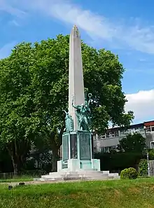 The monument includes a square obelisk constructed of Portland stone, a limestone quarried on the Isle of Portland in the English Channel. It is positioned on a base with three steps. The memorial features three bronze figures adjacent to the lower portion of the obelisk. On the fourth side of the obelisk, the back of the monument, there is a bronze cartouche. In addition, there are bronze plaques with the names of the fallen on all four sides of the base.[6] The statues include a winged Victory in the centre, with a laurel wreath. That statue is flanked by two additional bronze figures, one of Liberty with a torch and the other of Peace with flowers of remembrance.[6] The monument records the names of 769 soldiers from the area who died in World War I. It also lists the names of 476 soldiers and civilians who were killed during World War II.[7][8] The memorial was completed by the sculptor in 1922.[1]