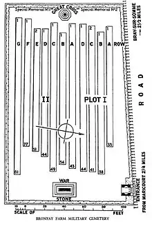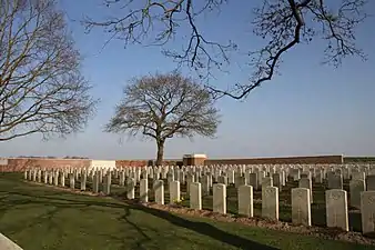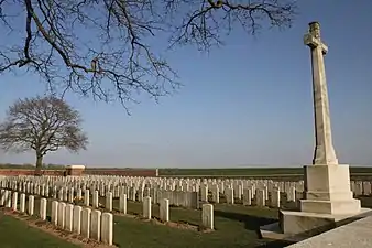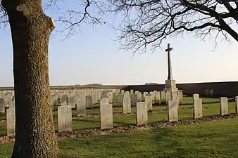 The Bronfay Farm Military Cemetery is a military cemetery located in the Somme region of France commemorating British, Commonwealth, and French soldiers who fought in the Battle of the Somme in World War I. The cemetery contains mainly those who died between October 1914 and February 1917 and in 1918 near Bronfay Farm and the nearby village of Bray.[1]