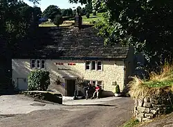 It has one pub, the Fox Inn, one phone box but two street lights. The Goyt Way (part of the Midshires Way) runs through it. The Fox Inn[1] and most of the cottages date from the 17th and 18th centuries and are Grade II listed.[2][3][4][5][6][7]