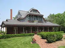 Brookfield station was originally built in 1889 as Grossdale station, when Samuel Eberly Gross, a Chicago lawyer, began selling building lots platted from farms and woodlands he had acquired along both sides of the Chicago, Burlington & Quincy Railroad line. Brookfield itself was originally known as "Grossdale," the name a request by Gross in return for the land used by the railroad.[2] The station was the first building Gross erected in the new subdivision. In 1981 the original station house was moved across the tracks onto the corner of Brookfield Avenue and Forest Avenue, and now houses the Brookfield Historical Society. The current Brookfield station serves as a standard commuter railroad station, while the old Grossdale station has been on the National Register of Historic Places since 1982.[5]