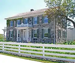 The William Brooks Farm consists of a farmhouse and various outbuildings, including a machine shop with a smokehouse, hog barns, dairy barns, a milk house, a silo, and a corn crib.[3] The farmhouse is a well-preserved two-story fieldstone Greek Revival structure built on a rectangular plan with side gables. The windows are six-over-six anes with shutters.[3] The front facade has a single-story, columned porch with Gothic detail, and the date of construction (1852) is carved into a stone block above the east-side window.[2][3] A covered porch is built on the rear.[3]