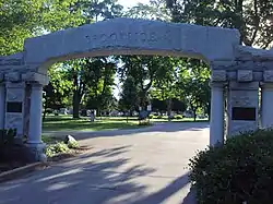 Although the cemetery is much larger, only 25 acres (10 hectares) is set aside as historic property by the National Register. The designated area comprises the original, rectangular plot of land that was set aside for the cemetery in 1853. In addition to graves, this property also includes an American Civil War memorial erected in 1882, a public mausoleum from 1913, and the 1915 stone arch entrance along North Union Street.[2]