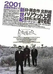 Brother (Japanese: ブラザー, Hepburn: Burazā) is a 2000 crime film starring, written, directed, and edited by Takeshi Kitano.[3] The film premiered on September 7, 2000 at the Venice Film Festival. The plot centers on a mature yakuza gangster who has to flee to America, where he unites forces with his little brother and his brother’s gang in Los Angeles.[4]