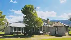 - Ranch House: Adobe L-shaped building with a tin hipped roof, including a main living room, a kitchen in the center, and a bedroom
