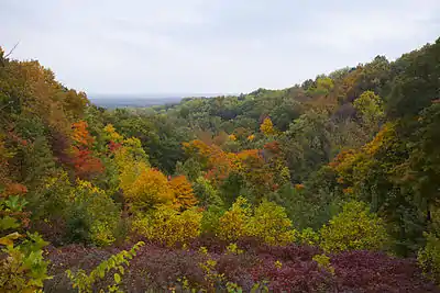 Unlike much of Indiana with its low rolling hills, the terrain of Brown County is rugged and hilly, with the drainage areas filled with brush, undergrowth, or trees.[7] The county's highest point (1,058 feet/322 meters ASL) is Weed Patch Hill, the third-highest prominence in the state.[8]
