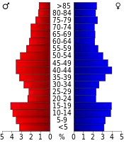 In the county, the population was spread out, with 26.40% under the age of 18, 7.40% from 18 to 24, 24.00% from 25 to 44, 22.70% from 45 to 64, and 19.50% who were 65 years of age or older. The median age was 40 years. For every 100 females there were 93.50 males. For every 100 females age 18 and over, there were 89.80 males.