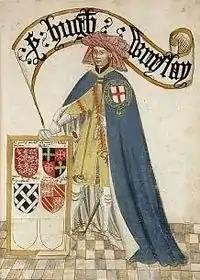 - ↑ Arms of John Chandos are generally given as Argent, a pile gules, not as shown in the Bruges Garter Book as Or, a pile gules