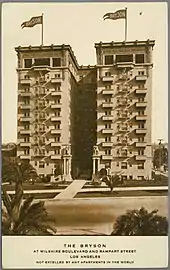 The Bryson was built in 1913 by real estate developer, Hugh W. Bryson, along a stretch of Wilshire Boulevard that was considered to be the "West Side" and which was then principally a residential area. Bryson acquired the property in 1911, purchasing and razing four houses that occupied the space.[2][3] He had originally intended to construct a six-story building flush with the sidewalks along Wilshire Boulevard and Rampart Street. When neighbors complained about his plans, Bryson chose instead to build a taller structure, but one set back 100 feet (30 m) from the centerlines of Wilshire Boulevard and Rampart Street.[4] In March 1912, Bryson announced his revised plans: "It is my intention to make this apartment house in a class by itself on this coast and finer than any other west of New York City. To that end, I shall spare no expense."[3]
