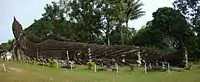 The statues are made of reinforced concrete and are ornate, and sometimes bizarre, in design.[5] The statues appear to be centuries old, though they are not. There are sculptures of humans, gods, animals, and demons.[4] There are numerous sculptures of Buddha, characters of Buddhist beliefs like Avalokiteśvara, and characters of Hindu lore, including Shiva, Vishnu, and Arjuna.[2] These sculptures were presumably cast by unskilled workers under the supervision of Luang Pu Bunleua Sulilat.[2] One notable sculpture resembles a giant pumpkin.[1] It has three stories representing three levels - Hell, Earth and Heaven.[1] Visitors can enter through an opening which is a mouth of a 3-metre-tall demon head (9.8 ft) and climb staircases from hell to heaven.[4] Each story contains sculptures depicting the level. At the top, there is a vantage point where the entire park is visible.[4] Another sculpture, an enormous 40-metre-long (130 ft) reclining Buddha, is also a park attraction.[6]