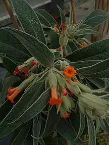 Buddleja speciosissima is a shrub 1–3 m high with light-brown fissured bark. It bears hermaphroditic flowers, unlike most South American members of the genus which are cryptically dioecious.[2] The young branches are thick, subquadrangular, and covered with a dense pale yellow indumentum, bearing subcoriaceous elliptic to lanceolate leaves with 1–3.5 cm petioles, and measuring 10–18 cm long by 2–4 cm wide, glabrescent above but tomentose below. The reddish-orange leafy inflorescences are 10–20 cm long, comprising 1–2 orders of branches bearing paired three flowered cymes, the corollas 25–30 mm long by 4 mm wide, pollination being by hummingbirds. Ploidy: 2n = 38.[2]