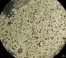 Buellia spuria, the disc lichen, is a white to light ashy gray crustose areolate lichen that grows on rocks (epilithic) in montane habitats.[2] It has a black edge from the conspicuous, more or less continuous prothallus, which can also be seen in the cracks between the areolas forming a hypothallus, and in sharp contrast with the whitish or ashy colored areolas.[2] It prefers mafic (siliceous) rock substrates.[2] In Joshua Tree National Park is can be seen on vertical granite and gneiss faces in washes.[3] It is common worldwide in the Northern Hemisphere.[2] It is very common in the Sonoran Desert from southern California to Arizona, Baja California, and Sonora, Chihuahua, and Sinaloa, Mexico.[2]