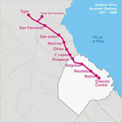Works began in Retiro, and shortly after that, more precisely in December 1862, the line to "Valentín Alsina" station (today "Belgrano C") was inaugurated. In 1863 the train reached San Isidro, with intermediate stops in Rivadavia and Olivos station. In February 1864 the Government allowed the company to use locomotives instead of horsecars for the Aduana-Retiro path. The railway continued its expansion, reaching San Fernando in 1864 and finally Tigre in 1865, totalizing 29 km length. Despite having requested an extension of the line to Zárate, the BANR would not build any track until it was transferred to Central Argentine Railway in 1889.