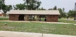 It is a 52 by 20 feet (15.8 m × 6.1 m) structure made of wood and coursed native stone, including two bathrooms at each end and an open pavilion area in the middle, built as a Works Progress Administration project. It was deemed: