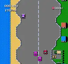 The enemy vehicles are cars and trucks. Cars can be bumped into obstacles or jumped upon and destroyed, while trucks cannot be bumped; they can only be jumped upon to destroy them, and will sometimes drop obstacles that will destroy the player or one extra life. At the end of each level players receive bonus points for the number of enemy vehicles crashed. Going from one level to another is characterized by a change of seasons. Players get points for bumping other cars and causing the other cars to crash.