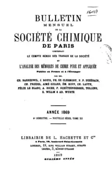 The Bulletin de la Société Chimique de France was a French peer-reviewed scientific journal on chemistry published by the Société Chimique de France.[1] It was established in 1858 under the title Bulletin de la Société Chimique de Paris (ISSN 0991-6504), under which additional name it appeared until the end of series 3.