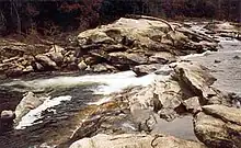 Bull Sluice is a benchmark Class IV+ rapid as rated by American Whitewater during normal flow of 1.8 to 2.4 feet.[1] It becomes easier at lower water and significantly more difficult at higher water. Bull Sluice is the largest and final named rapid of Section 3 of the Chattooga River. Since it is one of the more accessible rapids on the river, many boaters who run the narrower and more dangerous Section 4 will first run Bull Sluice before continuing downstream, making the rapid the de facto start of the final section of the river.