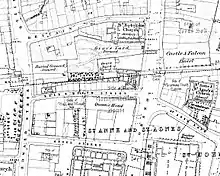 Bull and Mouth Street appears on Richard Horwood's map of London published in 1813.[7] An 1875 Ordnance Survey map shows there to have been a ward school on the north side at the western end and the French Protestant Chapel (1842) at the eastern end on the corner with St Martin's Le Grand.[6] On the south side was The Queen's Hotel on the corner with St Martin's Le Grand, formerly the Bull and Mouth Inn, rebuilt as a hotel by the coaching entrepreneur Edward Sherman at a cost of £60,000.[8] The architect was Savage.[4] The hotel provided accommodation for passengers and underground stabling for 700 horses.[9]