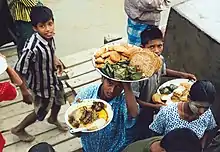 Traditionally, the Burmese eat meals from plates on a low table or daunglan, while sitting on a bamboo mat.[14] Dishes are simultaneously served and shared.[14] A traditional meal includes steamed white rice as the main dish accompanied by Burmese curries, a light soup or consommé, and other side dishes, including fried vegetables, Burmese fritters, and ngapi yay gyo (ငါးပိရည်ကျို), a plate of fresh and blanched vegetables served with pickled fish dip.[12] The meal is then finished with a piece of palm sugar or laphet (fermented tea leaves).[15]