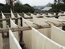 Burmese cuisine uses a wide variety of noodles, which are prepared in soups, salads, or other dry noodle dishes and typically eaten outside of lunch, or as a snack.[2] Fresh, thin rice noodles called mont bat (မုန့်ဖတ်) or mont di (မုန့်တီ), are similar to Thai khanom chin, and feature in Myanmar's national dish, mohinga. Burmese cuisine also has a category of rice noodles of varying sizes and shapes called nan, including nangyi (နန်းကြီး), thick udon-like noodles; nanlat (နန်းလတ်), medium-sized rice noodles; nanthe (နန်းသေး), thinner rice noodles; and nanbya (နန်းပြား), flat rice noodles.[43] Cellophane noodles, called kyazan (ကြာဆံ, lit. 'lotus thread') and wheat-based noodles called khauk swe (ခေါက်ဆွဲ),[43] are often used in salads, soups, and stir-fries.[2]